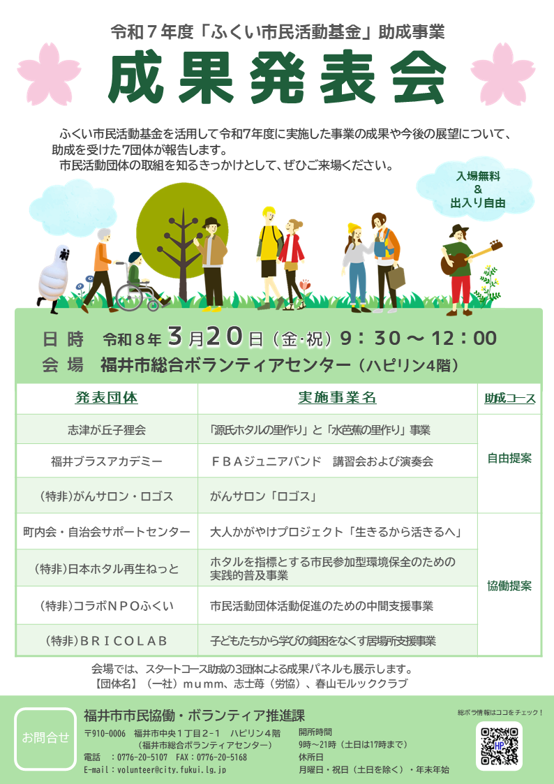 令和7年度に「ふくい市民活動基金」を活用して実施された事業の成果や今後の展望について、助成を受けた7団体が報告します。 市民活動団体の取組を知るきっかけとして、ぜひご来場ください! 入場無料&出入り自由です! 【発表団体】(『提案事業名』/団体名) 自由提案コース (9:40頃~10:30頃) 1 『「源氏ホタルの里作り」と「水芭蕉の里作り」事業』/ 志津が丘子狸会 2 『FBAジュニアバンド 講習会および演奏会』/ 福井ブラスアカデミー 3 『がんサロン「ロゴス」』/ (特非)がんサロン・ロゴス 協働提案コース (10:30頃~11:40頃) 1『大人かがやけプロジェクト「生きるから活きるへ」 』/ 町内会・自治会サポートセンター 2『ホタルを指標とする市民参加型環境保全のための実践的普及事業』/ (特非)日本ホタル再生ねっと 3『市民活動団体活動促進のための中間支援事業』/ (特非)コラボNPOふくい 4『子どもたちから学びの貧困をなくす居場所支援事業 』/ (特非)BRICOLAB 【パネル展示団体】(『提案事業名』/団体名) スタートコース 1 『教育施設が集中する市街地エリアにおける高校生の居場所(ユースセンター)事業』/ (一社)mumm 2 『足羽三山に生息するシロミノヤブヘビイチゴの調査研究・ガイド』/ 志士苺 労働者協同組合 3 『モルックで春山地区を元気に!!』/ 春山モルッククラブ ※自由提案コース及び協働提案コースはプレゼンテーションによる報告、スタートコースはパネル展示での報告になります。 <ふくい市民活動基金とは?> 地域社会全体でまちづくりを進めていくことを目的に、市民や企業の皆様からの寄附金を積み立てているものです。 この基金を財源として、市民活動団体が行う公益的な活動や、小中学生が行うボランティア活動に対して助成を行っています。 |