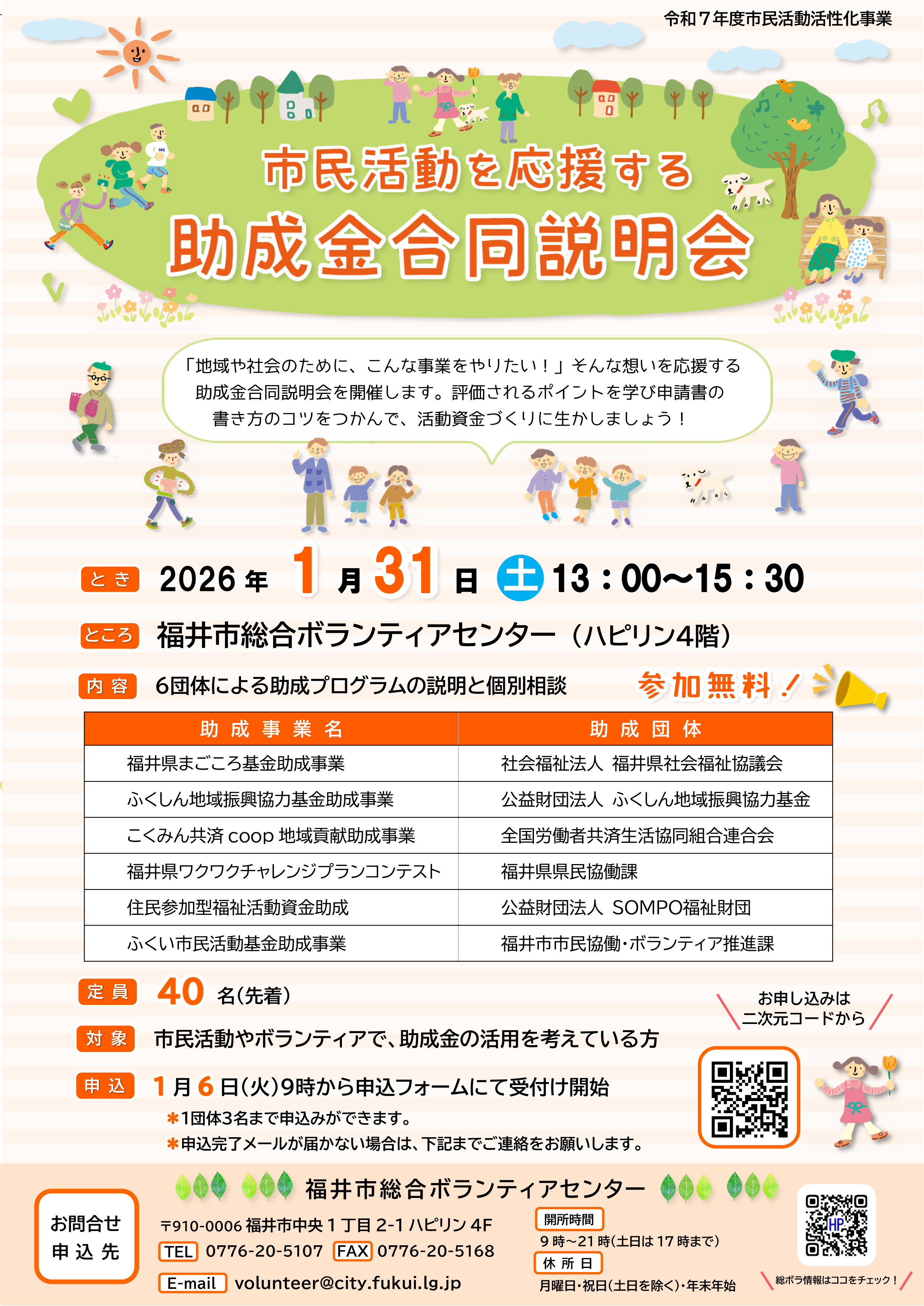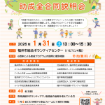 「地域や社会のために、こんな事業がやりたい!」 そんな想いに応える助成金制度の合同説明会を開催します。 6団体の助成プログラムについて、担当者からリレー形式の説明があり、説明会後には個別相談を行います。 評価されるポイントや申請のコツをつかんで、活動資金づくりに生かしてみましょう! 【説明事業】 ・福井県まごころ基金助成事業 (社会福祉法人 福井県社会福祉協議会) ・ふくしん地域振興協力基金助成事業 (公益財団法人 ふくしん地域振興協力基金) ・こくみん共済coop地域貢献助成事業 (全国労働者共済生活協同組合連合会) ・福井県ワクワクチャレンジプランコンテスト (福井県 県民協働課) ・住民参加型福祉活動資金助成 (公益財団法人 SOMPO福祉財団) ・ふくい市民活動基金助成事業 (福井市 市民協働・ボランティア推進課) 【対象】 市民活動やボランティアで、助成金の活用を考えている方 ▼▼申込みはこちらから▼▼ https://shinsei.e-fukui.lg.jp/SksJuminWeb/EntryForm?id=tLdLorvy |