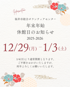 日頃より、福井市総合ボランティアセンターをご利用いただきありがとうございます。