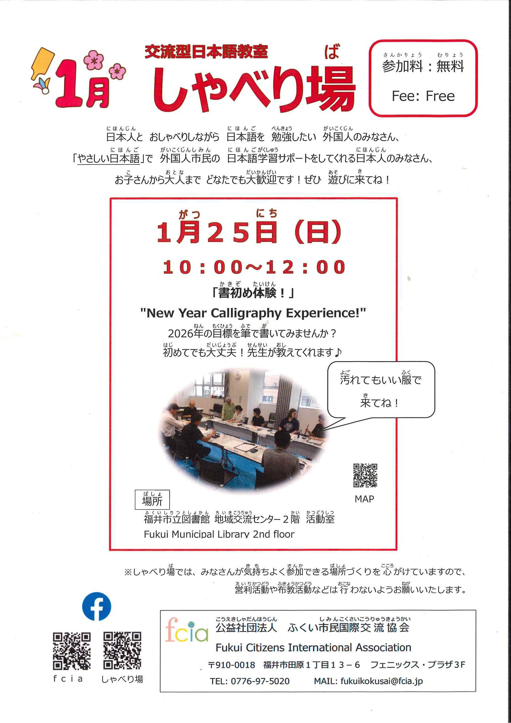 件名に「しゃべり場」、本文に名前と職業(会社員、学生など)を記入して、以下のアドレスにメールを送ってください。                                                                                                   fukuikokusai@fcia.jp
