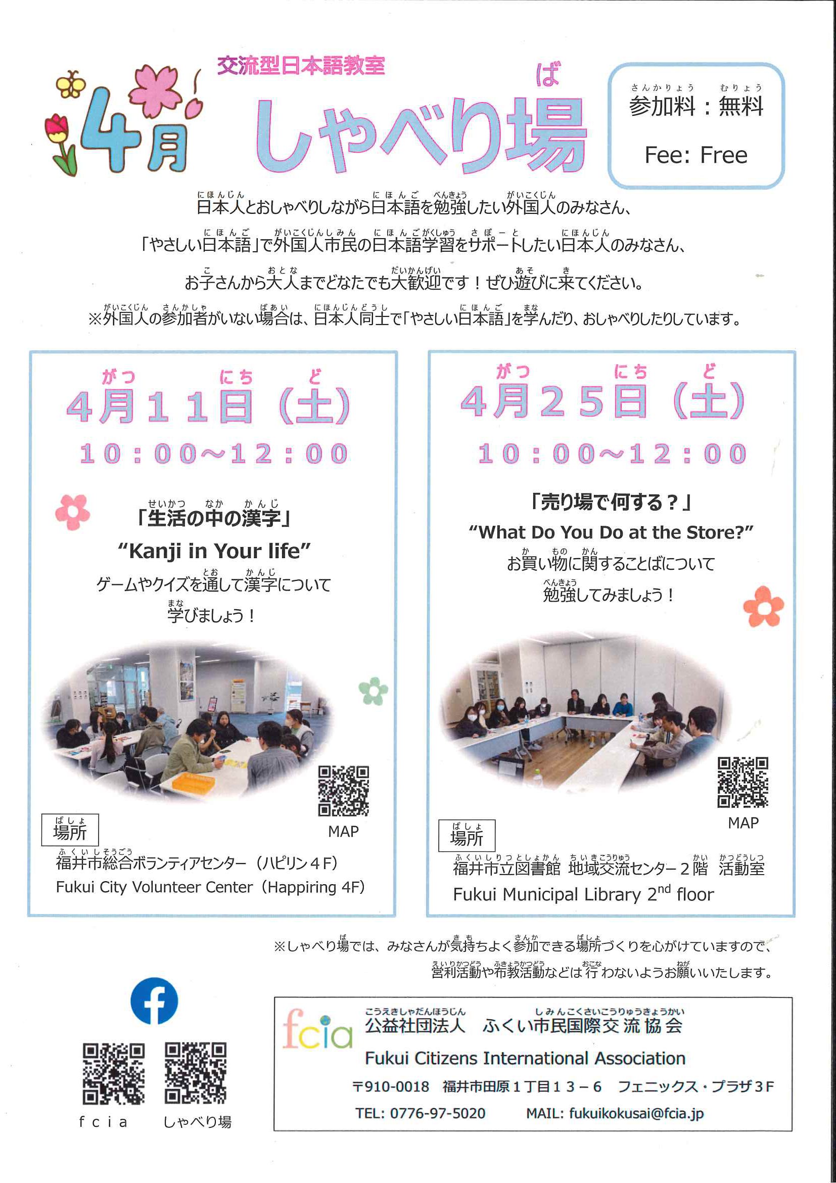 | 内容 | しゃべり場は、福井市に住む外国人と日本人がやさしい日本語で交流する場です。コーディネーターがクイズやゲームなどを通して会をすすめ、楽しく日本語や日本文化を学習します。 外国人の参加者がいない場合は日本人同士で「やさしい日本語」を学んだり、おしゃべりしたりしています。会場で準備・受付・片付け・外国人の学習サポートを手伝ってくださるボランティアを募集します。 |