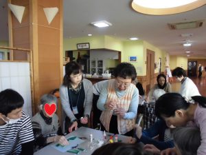参加者はボランティアの手を借りて、たんぽぽ、つくし、ちょうちょ、かえる などを折り、台紙に貼り付けます。「上手、上手」「いいわ~」と言う声と共に、会場は季節感で一杯になりました。最後は、自分の名前を書いて出来上がりです。「お部屋に飾れるわ」「こうやってみんなで集まれて楽しかった」「また、やりたいから来てね」という声を頂きました。受講生は「喜んでいただけてうれしい、それが一番のご褒美です」と充実した表情でした。その後、施設内の会議室をお借りして、反省会と今後の打合せを行いました。認知症講座を受けて、高齢者の理解を深めようという意見も出るなど前向きな皆さんでした。