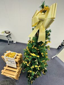 この展示を主催した守る会の代表幹事 坪田氏は、「小児がんは、医療の進歩により病気によっては8割治る病気になりました。一方で亡くなる子はやはりいるのです。病気が寛解しても、手術や化学療法等の治療後に生じる晩期合併症などの後遺症と一生付き合わなければなりません。展示を見て小児がんのことを知ることから始めてください。ゴールドのようにキラキラ輝く子どもたちの未来を願って、リボンをツリーに結んでください。」と想いを述べられました。