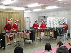 マリンバを演奏をしているのは、「マリンバ好きっぷ」という60代の女性5人のボランティアグループ(道端さん、指平さん、宮崎さん、新井さん、森田さん)です。グループで、高齢者施設、子育て支援センター、保育園、地域のイベントなどで演奏活動をされています。この12月だけでも3回の出演の要請があったそうです。