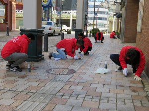 福井ロータリークラブが福井駅周辺にて、8時から約1時間にわたり「ガム取り大作戦」というタイトルの清掃活動を行いました。県下の他8ロータリークラブをはじめ駅前周辺商店街、福井商工会議所、福井市旅館業協同組合などの関係者と、口コミで活動を知り賛同した企業、学校、家族連れなど約280名で活動は行われ たものです。黒く硬くなったガムに溶剤をかけ、ひとつひとつヘラで丁寧に除去していきました。